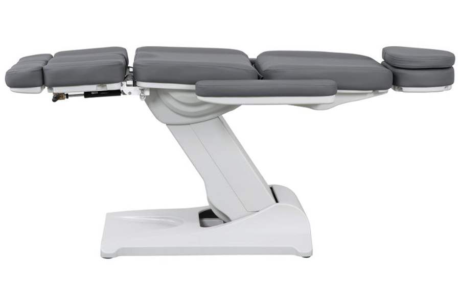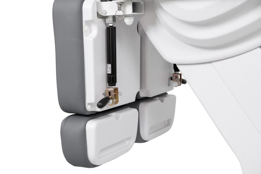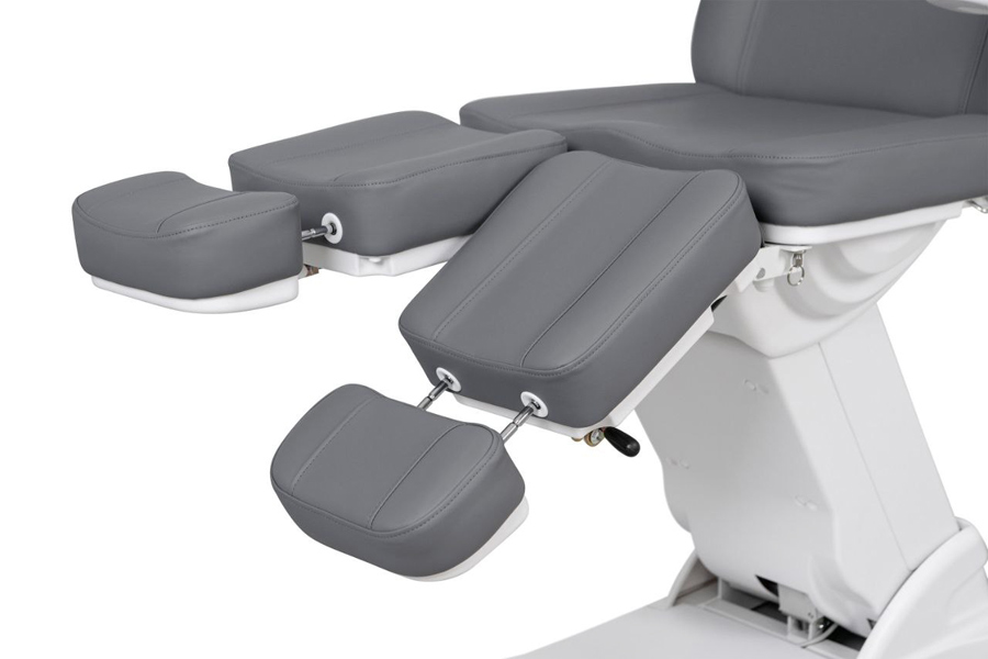 Ножная секция регулируется пневматическими амортизаторами, и оснащена выдвижными подпяточниками. Подлокотники кресла регулируются, так же их можно снять. Выдвижной подголовник с отверстием для лица.